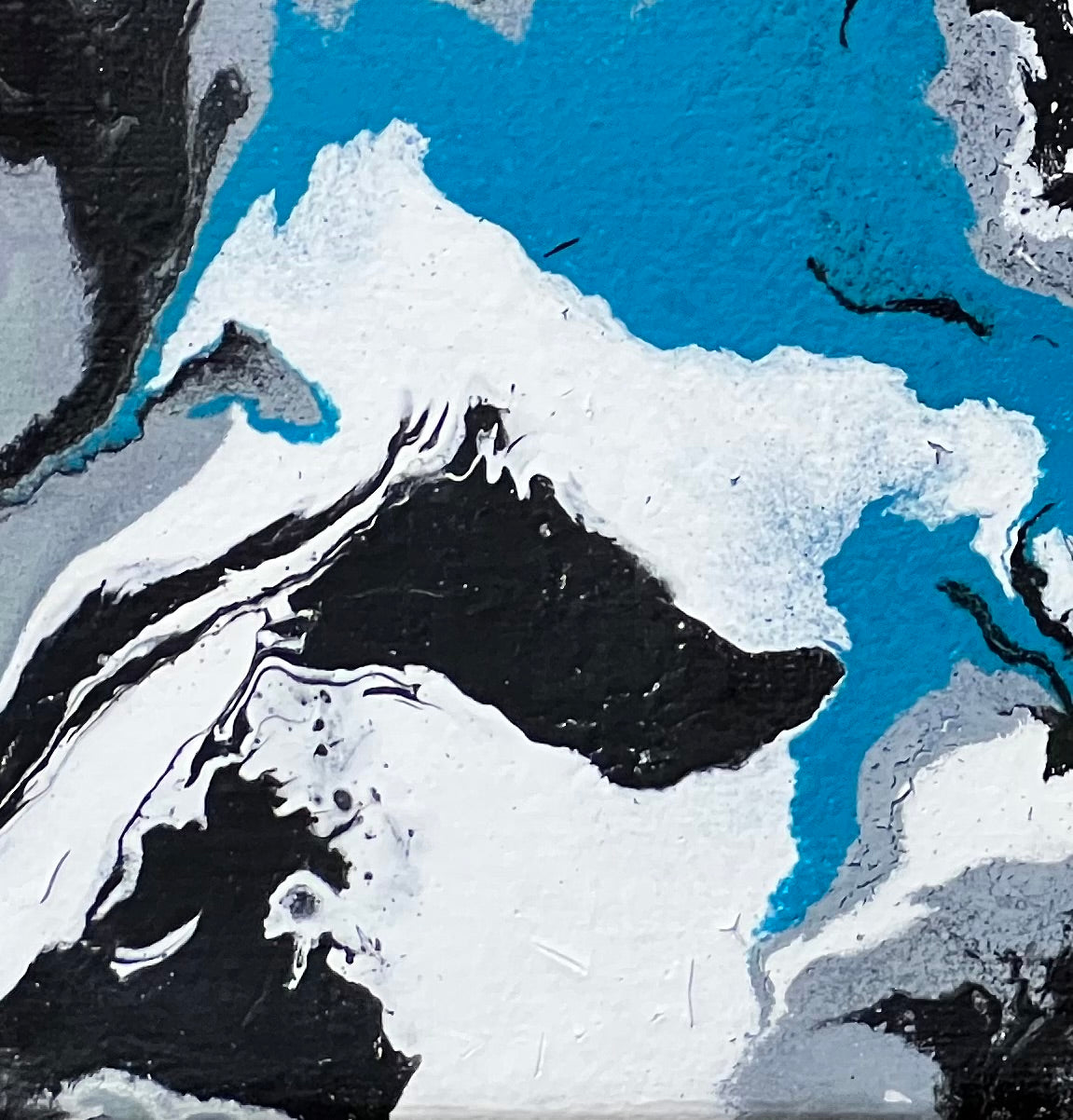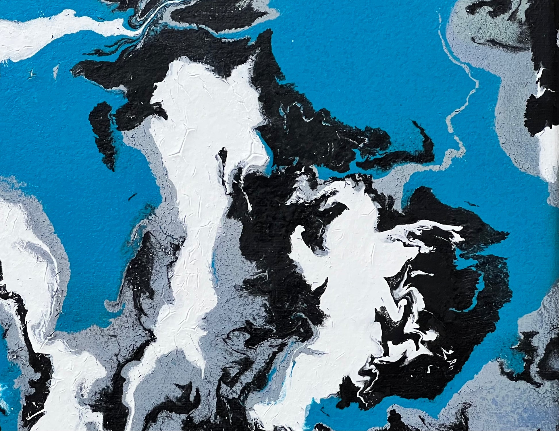 Lo que emerge aquí es movimiento consciente. Las corrientes profundas como mapas internos que se abren paso entre lo oscuro y lo luminoso. El azul no es solo un color; es respiración, espacio para que el alma se expanda. El blanco aparece como revelación, como verdad que se abre paso y el negro no pesa. ¡Sostiene! Contiene la fuerza del proceso. Esta obra no está quieta. Late, fluye, se transforma. La obra revela el diálogo entre profundidad y claridad, recordándonos que toda transformación auténtica nace del movimiento interno.