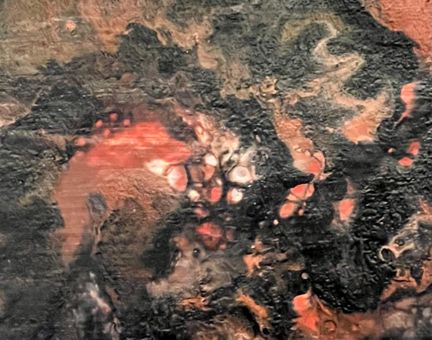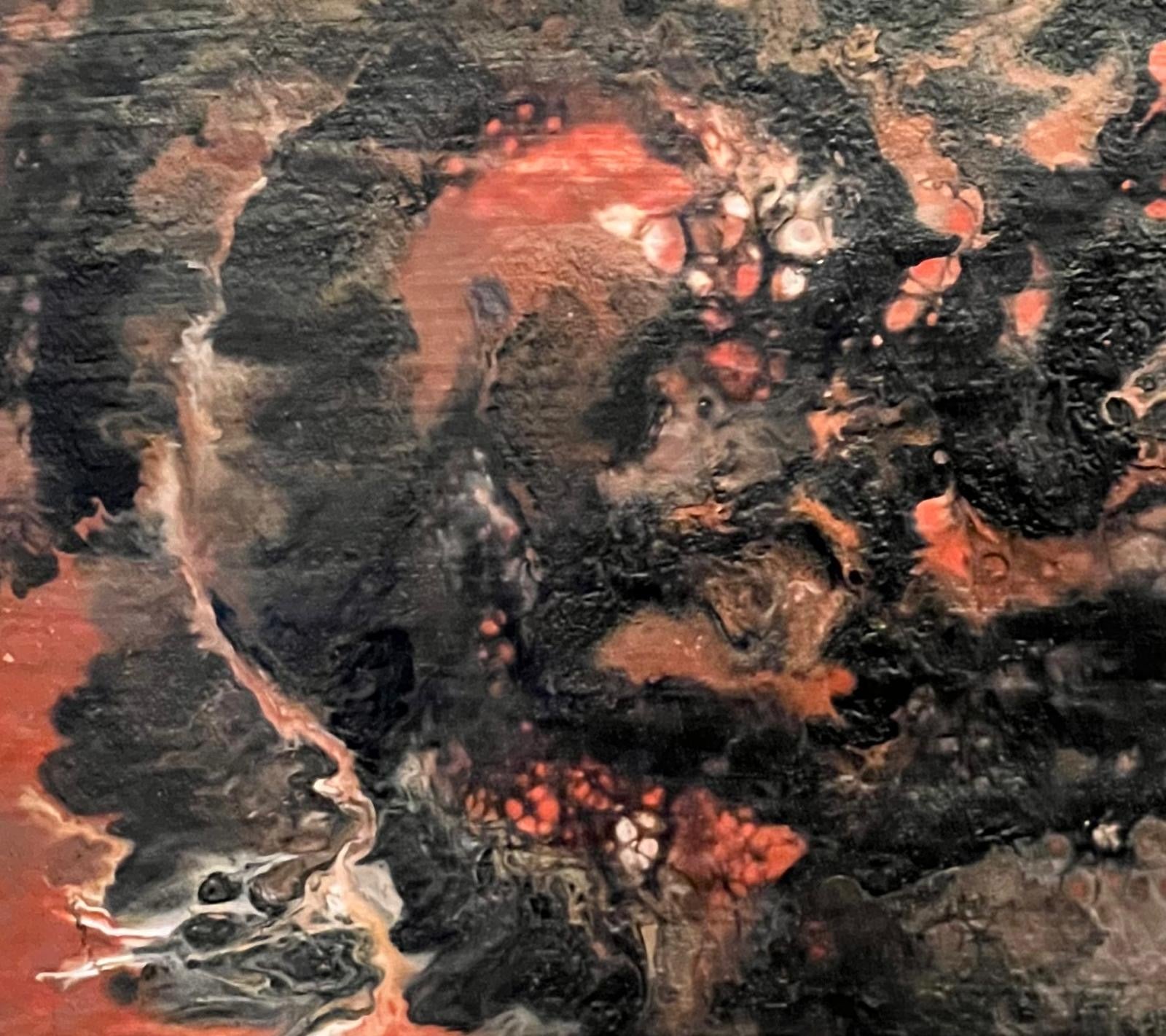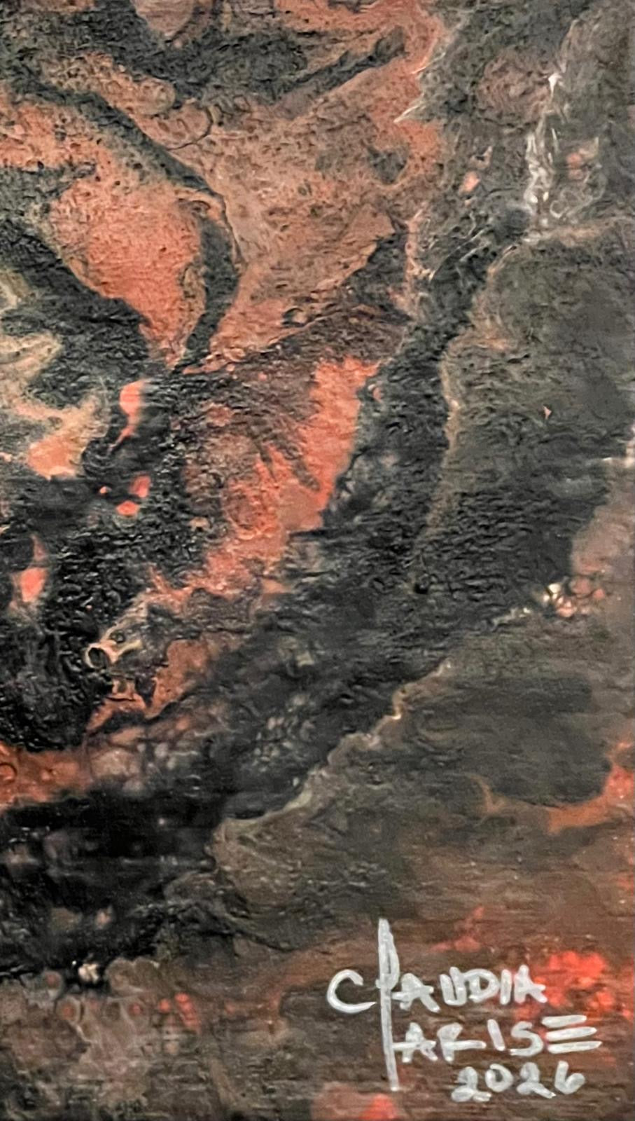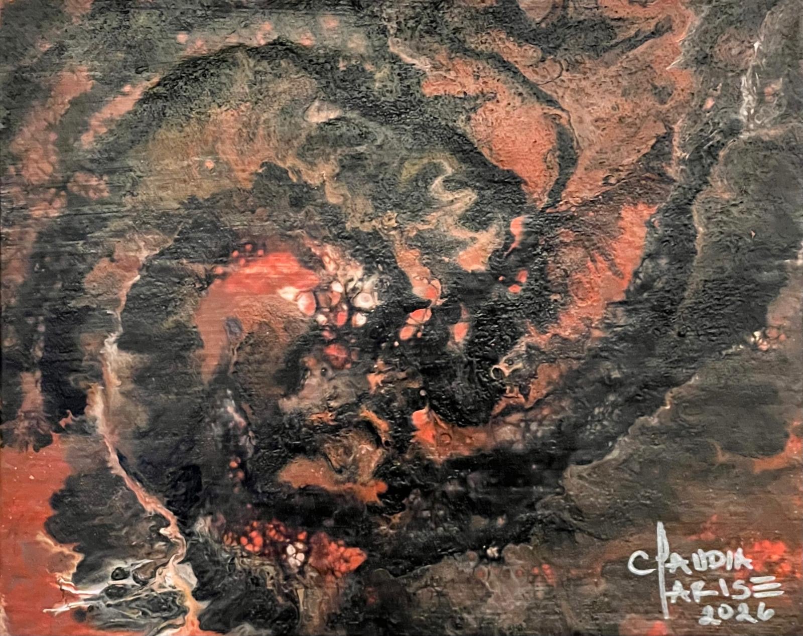 Esta obra nace del movimiento de la materia y la emoción. Capas oscuras se entrelazan con tonos de tierra y fuego, revelando un núcleo vivo que resiste, pulsa y permanece.