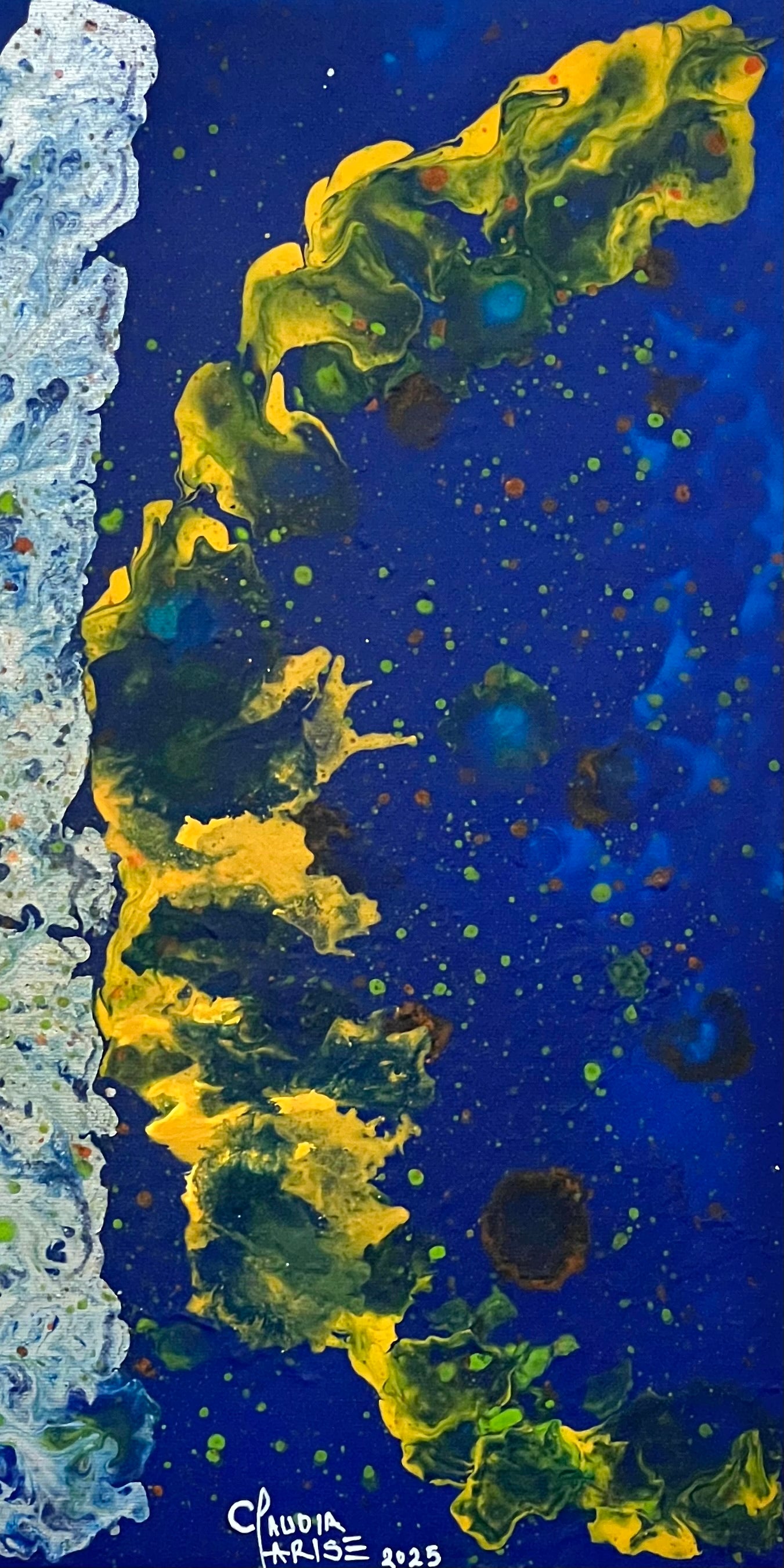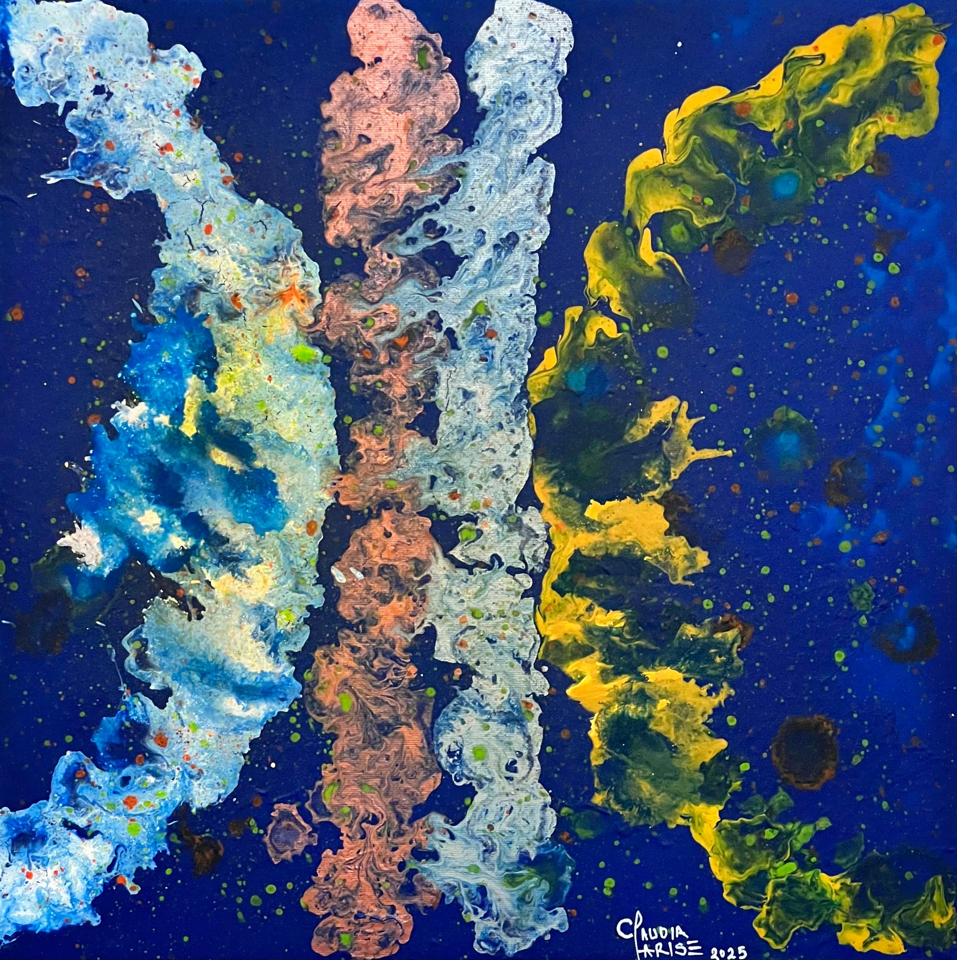A través de la técnica de arte fluido con acrílico sobre lienzo, Claudia Parise crea un diálogo visual entre tres estados del ser: lo que fuimos, lo que somos, y lo que estamos permitiendo nacer.