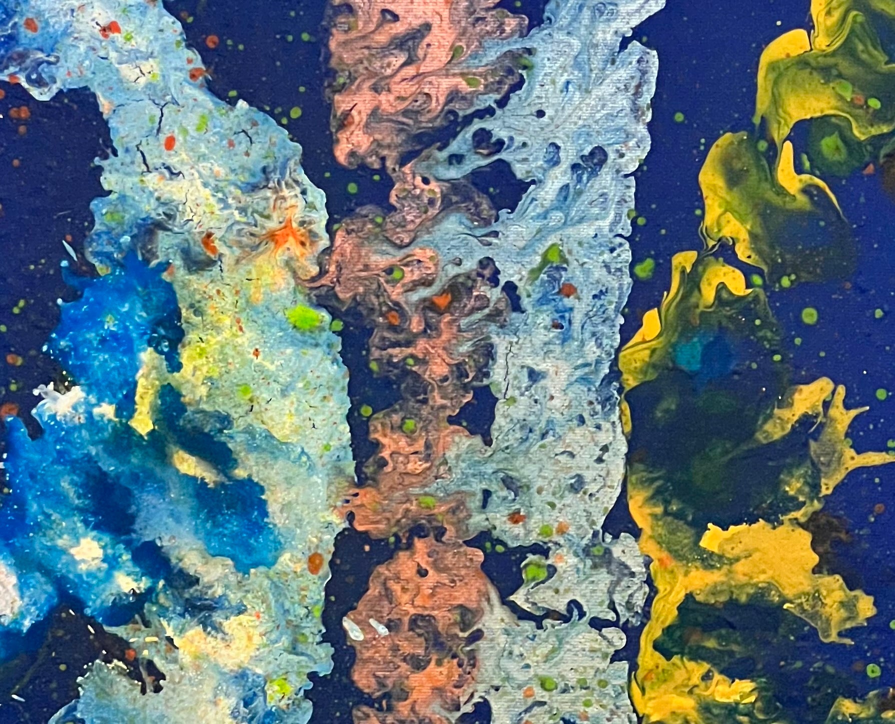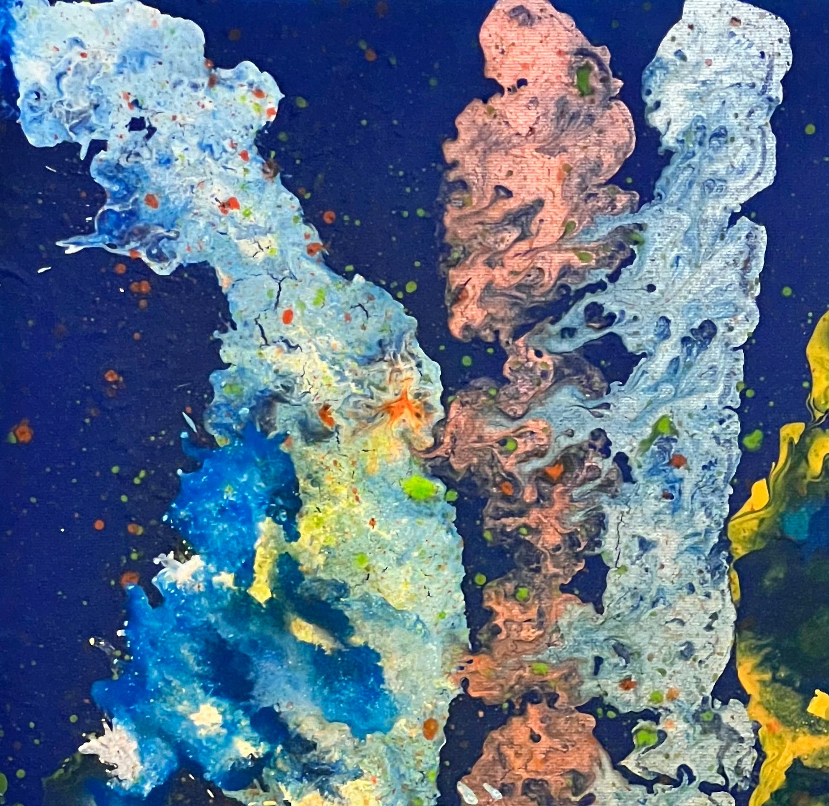 Los colores fluyen y se entrelazan como memorias que danzan entre el pasado, el presente y el futuro. Cada capa de pintura representa una capa de nuestra existencia, cada movimiento del acrílico simboliza la fluidez del tiempo y la constante evolución del alma.